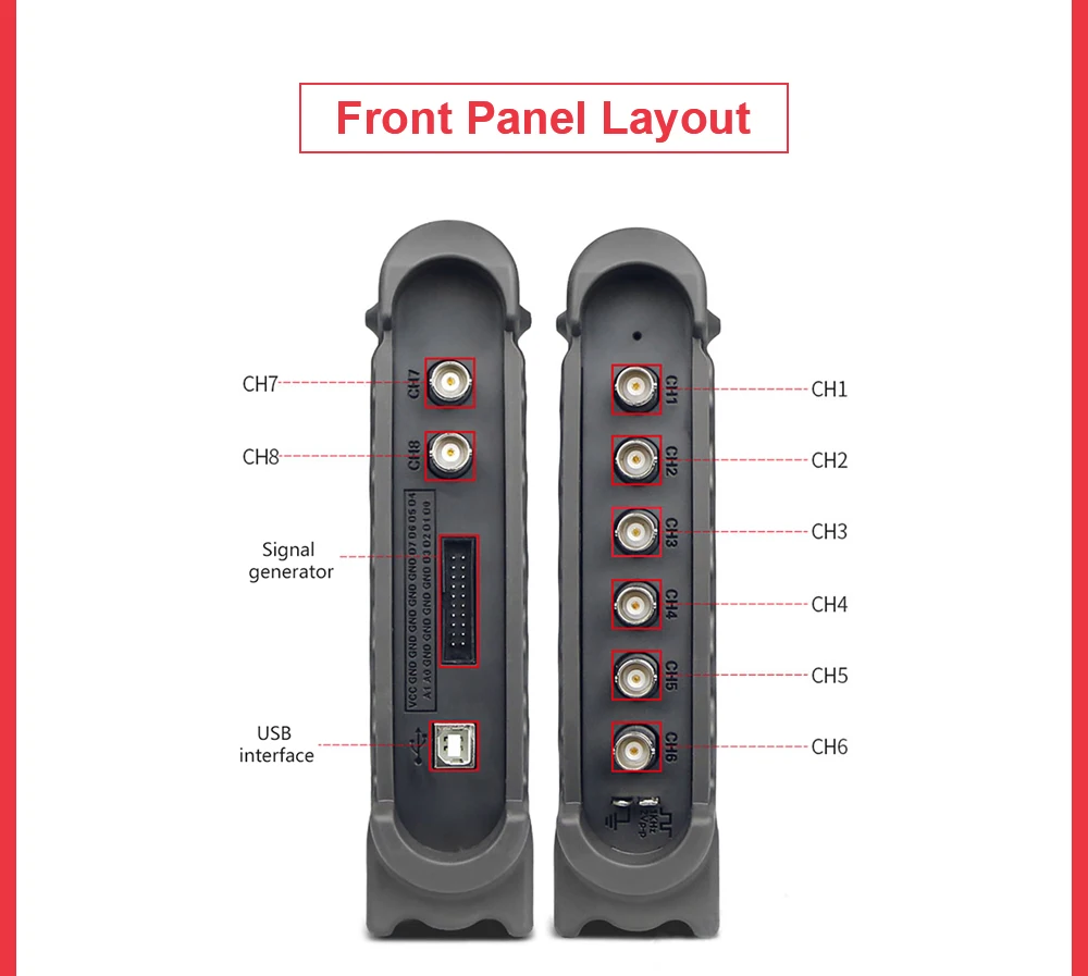 Osciloscopio de 8 canales para pruebas de vehículos. Más de 80 tipos de función de diagnóstico Automotriz (ENCENDIDO/sensor/detección de bus/rendimiento/arranque y circuitos de carga, etc.) función de ayuda de vídeo, proporciona la ayuda de vídeo de diagnóstico que se puede ver en línea, el resultado del diagnóstico puede generar un informe de diagnóstico. Impreso o tomado una captura de pantalla presionando una tecla, muchos métodos para guardar los datos. Compatible con grabar formas de onda durante mucho tiempo. Puede simular el árbol de levas y la señal del cigüeñal. Transmite señales a través de la interfaz USB 2,0 Plug and Play, y no necesita fuente de alimentación adicional.